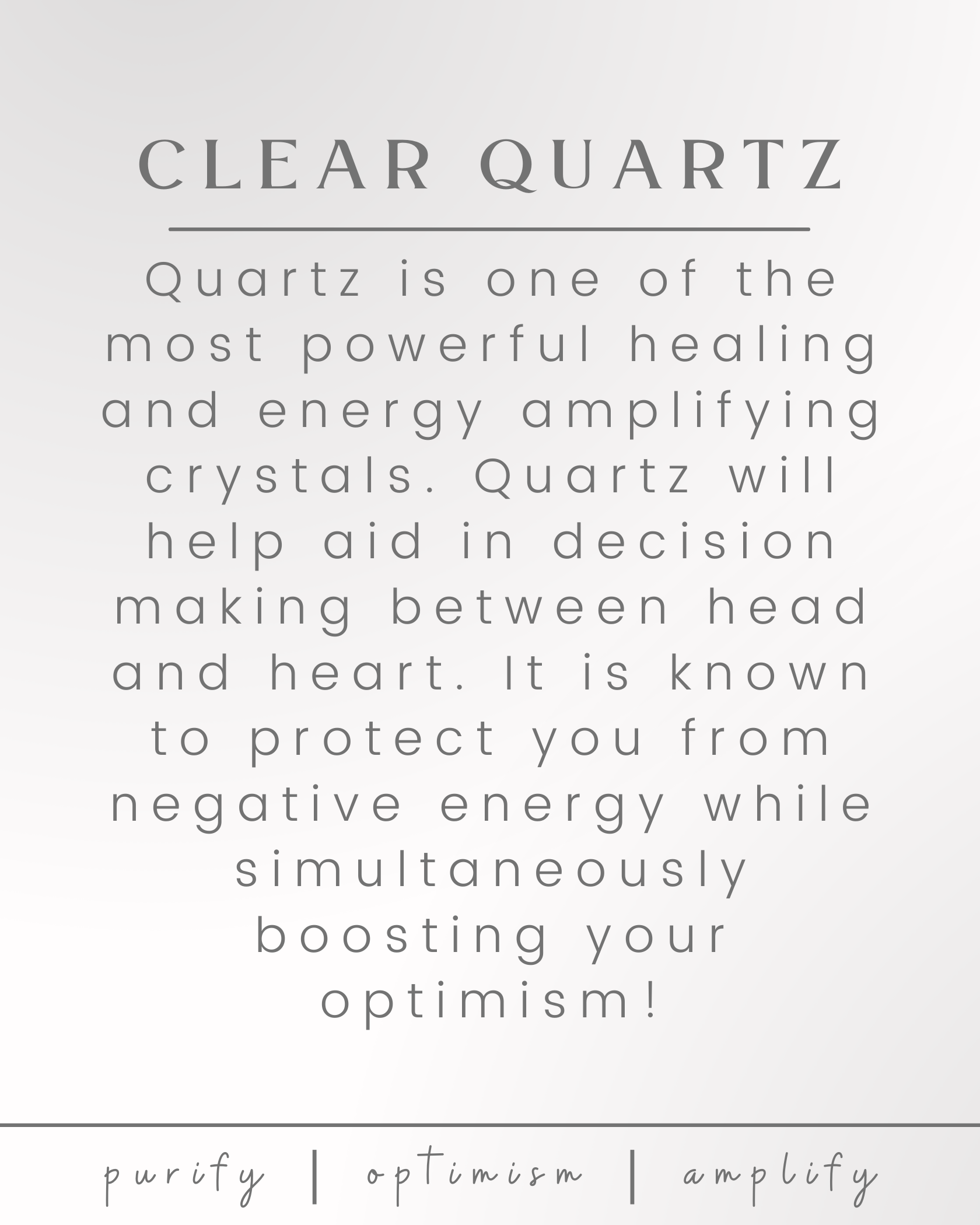 Quartz is one of the most powerful healing and energy amplifying crystals. Quartz will help aid in decision making between head and heart. It is known to protect you from negative energy while simultaneously boosting your optimism!