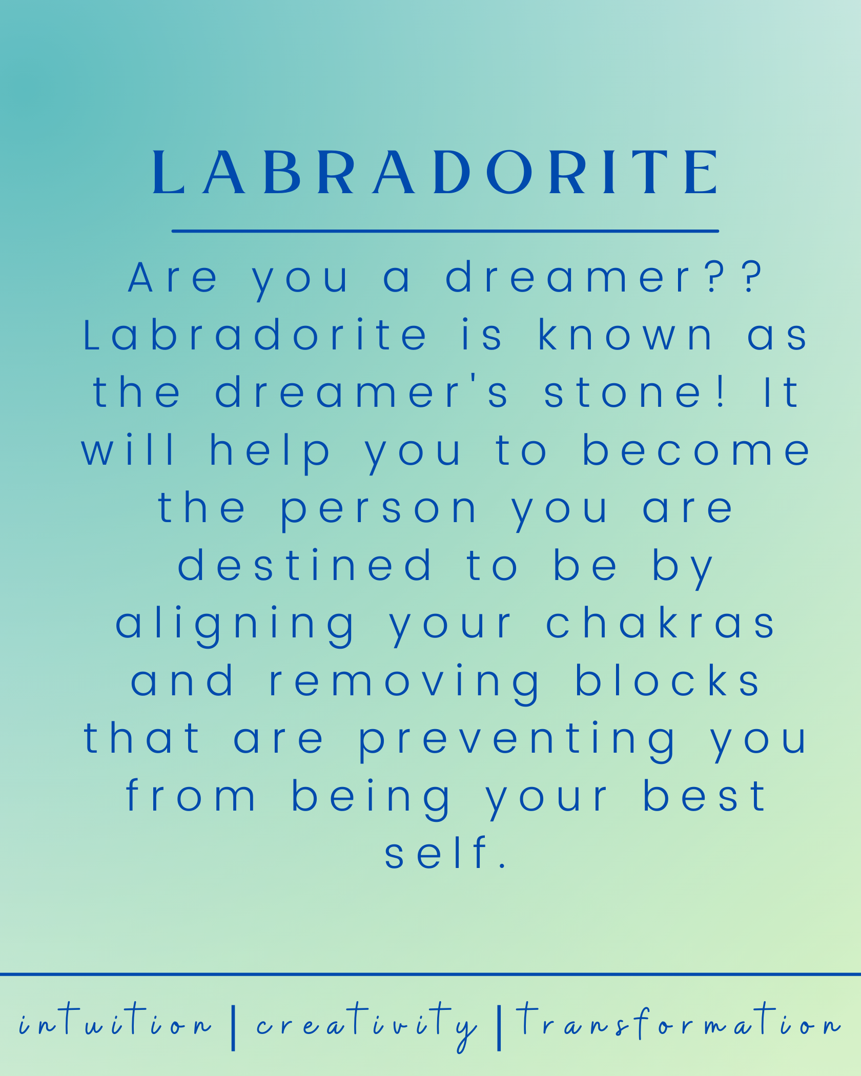 Labradorite is known as the dreamer's stone! It will help you to become the person you are destined to be by aligning your chakras and removing blocks that are preventing you from being your best self.