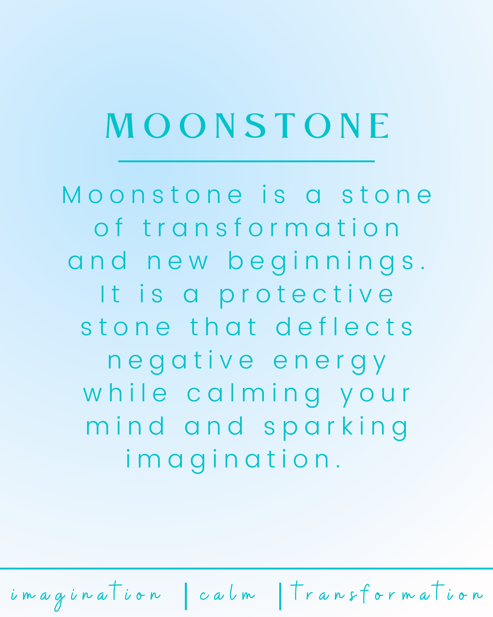Moonstone is a stone of transformation and new beginnings. It is a protective stone that deflects negative energy while calming your mind and sparking imagination.